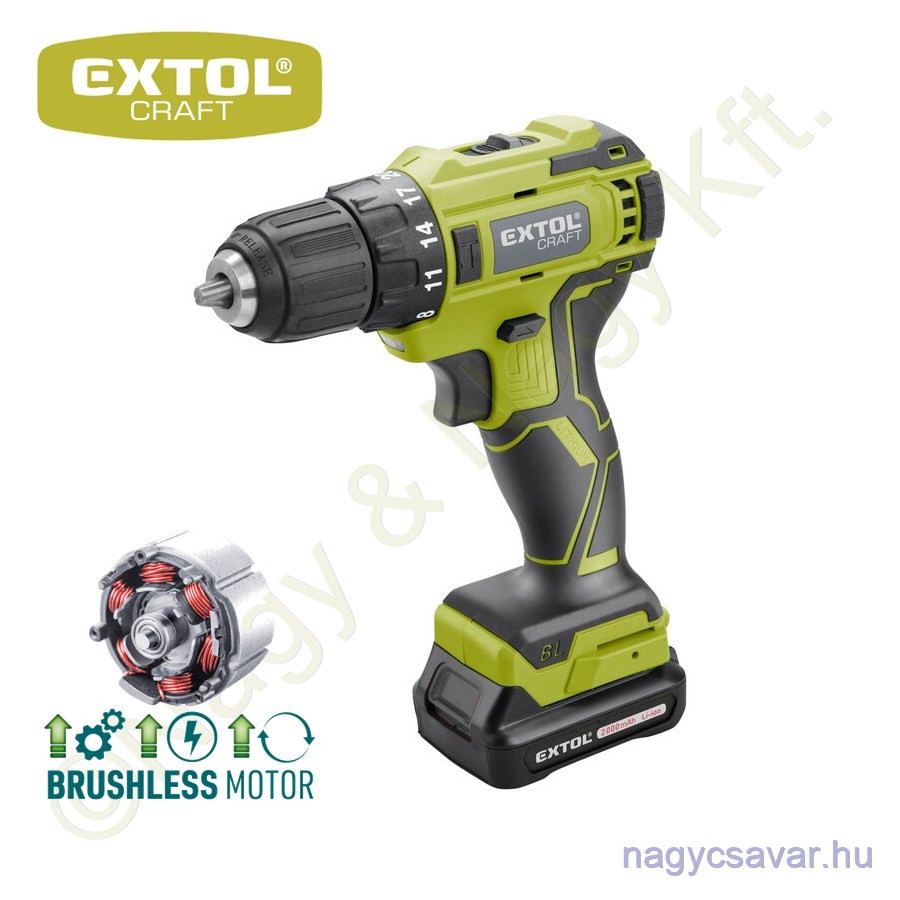 | Rövid leírás a termékről | Az Extol Craft „Brushless” (szénkefe nélküli) motorral készült könnyű és nagy teljesítményű, két sebességtartományú akkus fúró-csavarozót (akkus fúrót) közepesen nehéz fúrásokhoz és csavarozásokhoz lehet használni, fém és fa munkadarabok esetében. A „Brushless” (szénkefe nélküli) motor nagyobb hatékonysággal, kisebb energiafogyasztással, hosszabb idejű munkavégzésekhez használható, illetve az ilyen motor élettartama is hosszabb, mint a szénkefés motorok élettartama.