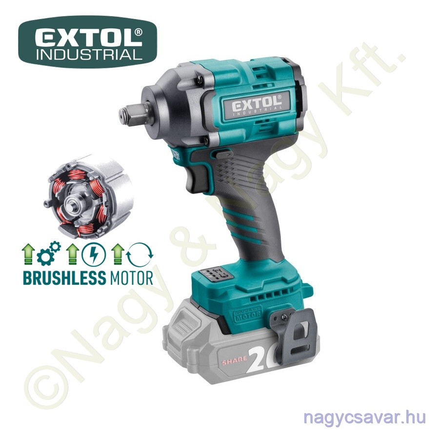 | Rövid leírás a termékről | Az Extol® Industrial akkus ütvecsavarozó 1/2"-os négyszög menesztő található, amelyre rá lehet húzni a megfelelő méretű dugókulcsokat, anyák és csavarok meghúzásához és lazításához. Nagy hatékonyságú, kefementes motor, ami megbízhatóbb működést és hosszabb élettartamot biztosít. A forgatónyomaték elektronikus beállításával a készülék védi a csavarkötéseket. Az akku az EXTOL SHARE20V sorozat minden típusú gépében használható.
