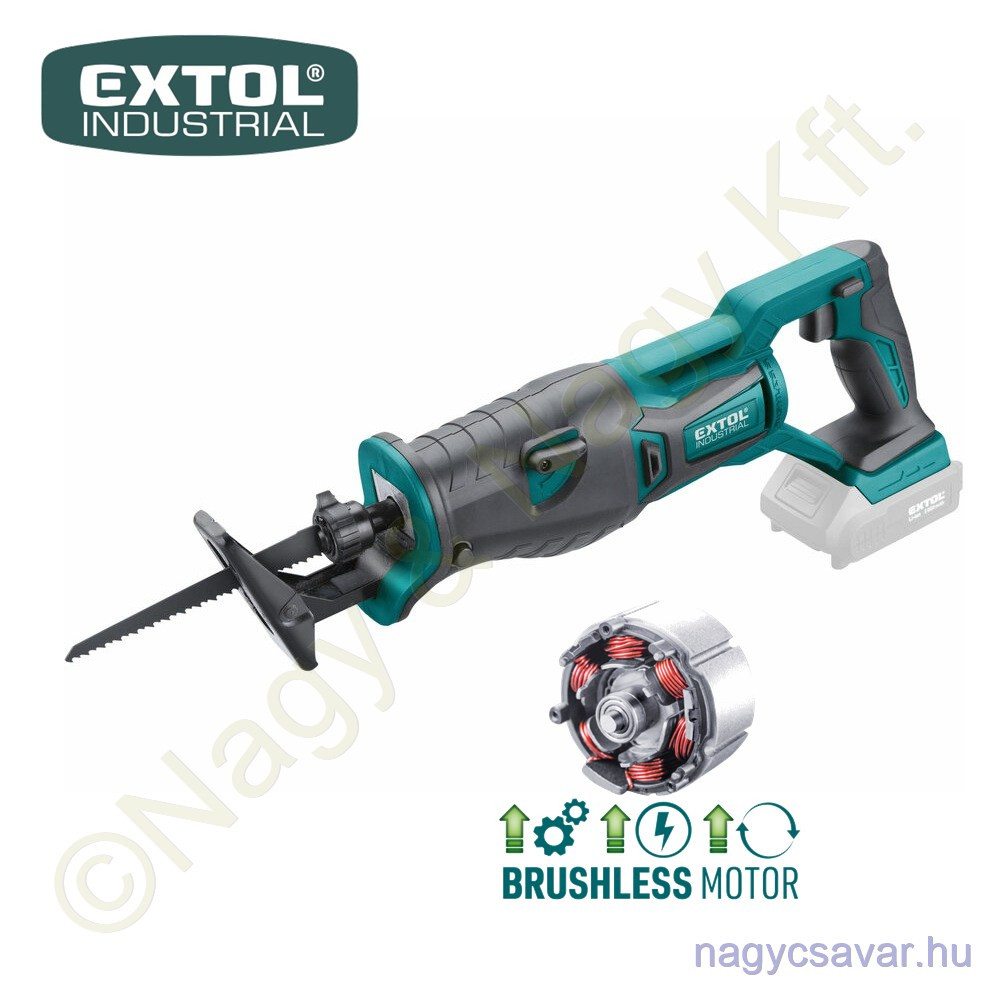 | Rövid leírás a termékről | A kefe nélküli akkumulátoros szablyafűrészgép fa, műanyag, fém és más hasonló anyagok vágására tervezték műhelyben, garázsban vagy kertben végzett munka során. A szablyafűrészt a legmodernebb "kefe nélküli" motor hajtja. Ez az új típusú motor hosszabb élettartammal rendelkezik, erősebb és kevesebb energiát fogyaszt, mint a hagyományos szénkefe motorok. A rugalmas fűrészlap nemcsak egyenes és íves vágásokat tesz lehetővé, hanem a nehezen hozzáférhető helyeken (sarkok, fal mentén) történő vágást, fák metszését is. Ennek a szablyafűrésznek a fő előnye a akkus meghajtó, mellyel ezt a gépet magával viheti, ahol dolgozni kell vele, függetlenül attól, hogy van-e áramforrás. A fűrész biztonsági zárral rendelkezik a véletlen indítás ellen, és állítható előbeállítással rendelkezik, amelyet a vágandó anyagtól függően állíthat be. Normál munkához elég egy vagy két 2000mAh-s akku, amit egy gyorstöltőben gyorsan feltölthet, az igényesebb vagy hosszabb munkavégzés esetén nagyobb, 4000mAh kapacitású akkumulátorokat ajánlunk.az EXTOL SHARE20V sorozat minden típusú szerszámában használható.A Li-ion technológiának köszönhetően az akkumulátorok bármikor újratölthetők anélkül ez csökkentené a kapacitásukat. A Li-ion akkumulátor lassan veszít energiát, és feltöltve és használatra kész sokáig.