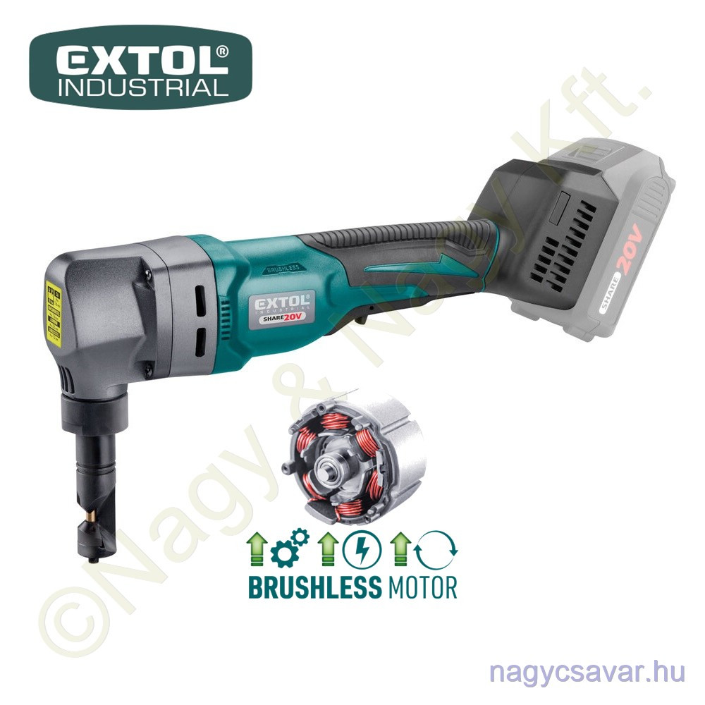 | Rövid leírás a termékről | A SHARE 20 V akkus programba tartozó Extol Industrial akkus lemezvágóval lapos, hullám- vagy trapézlemezeket lehet vágni anélkül, hogy a vágási él meggörbülne vagy deformálódna. Az elforgatható vágófejnek köszönhetően bármilyen, akár 360°-os alak is kivágható. A vágófejen található mérőhornyok segítésével ellenőrizhető a lemezvastagság.