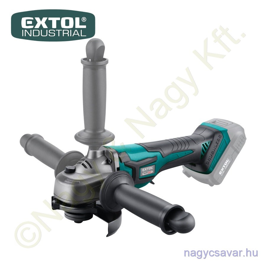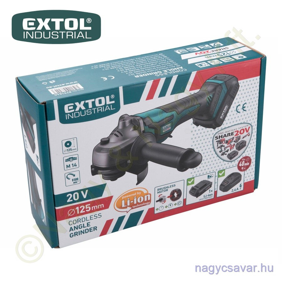 | Rövid leírás a termékről | Könnyű és nagy teljesítményű kefe nélküli akkumulátoros sarokcsiszoló csiszolási és vágási munkákhoz. A sarokcsiszolót a legkorszerűbb „kefe nélküli" motor hajtja. Ez az új motortípus hosszabb élettartammal rendelkezik, erősebb és kevesebb energiát fogyaszt, mint a hagyományos szénkefe motorok. Teste ergonomikusan van kialakítva, hogy munka közben könnyen kézben lehessen tartani, a gumírozott fogantyú pedig csillapítja a rezgéseket. Ennek a sarokcsiszolónak a fő előnye az akkumulátor meghajtás, amely lehetővé teszi, hogy a sarokcsiszolót magával vigye oda, ahol dolgoznia kell vele, függetlenül attól, hogy van-e tápfeszültség. A sarokcsiszoló biztonsági reteszeléssel rendelkezik a véletlen indítás ellen, és lágyan indul, így nem csak az ízületeit, hanem a sarokcsiszolóban lévő fogaskerekeket is kíméli. Rövid munkához elég egy-két 2000mAh-s akku, amit gyorsan feltölthet egy gyorstöltőben, igényesebb vagy hosszabb munkához a nagyobb akkumulátorokat ajánljuk 4000–8000mAh kapacitással. Az akkumulátor minden típusú EXTOL SHARE20V szerszámban használható, és az alkalmazott Li-ion technológiának köszönhetően bármikor újratölthető anélkül így csökkenti a kapacitását. A Li-ion akkumulátor nagyon lassan veszít energiát, és feltöltve és használatra kész sokáig.