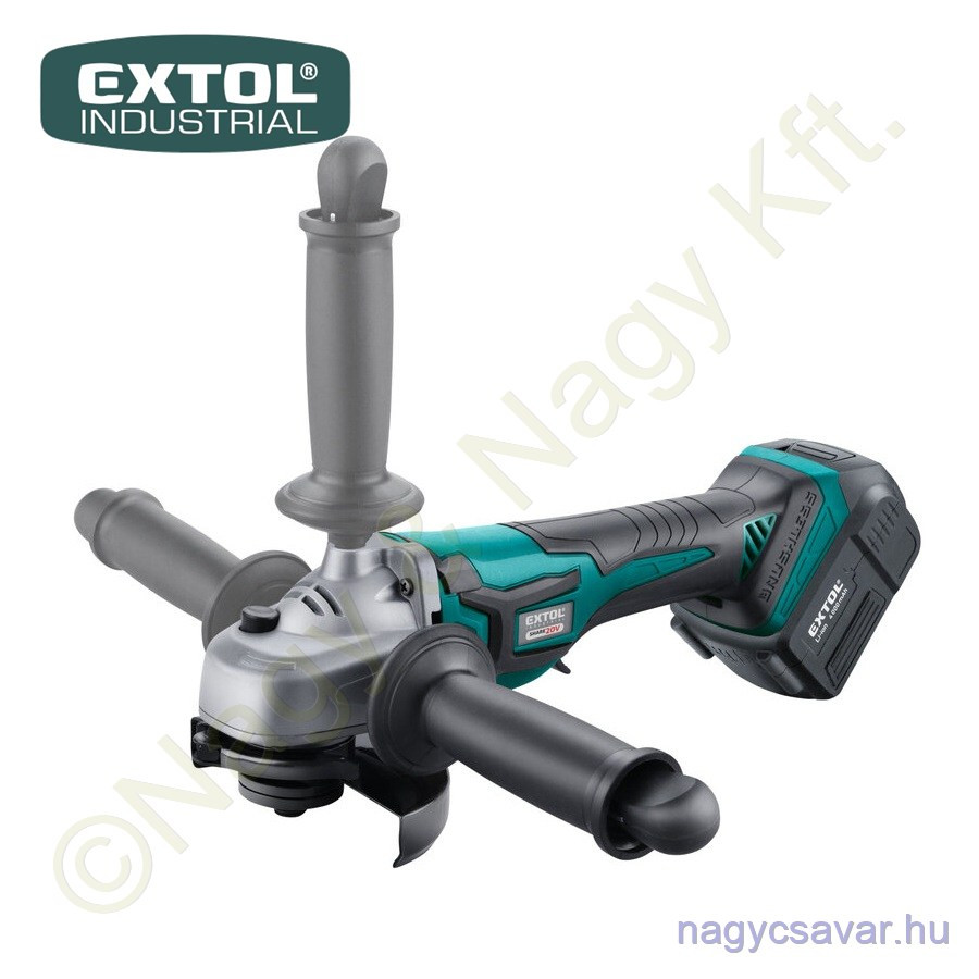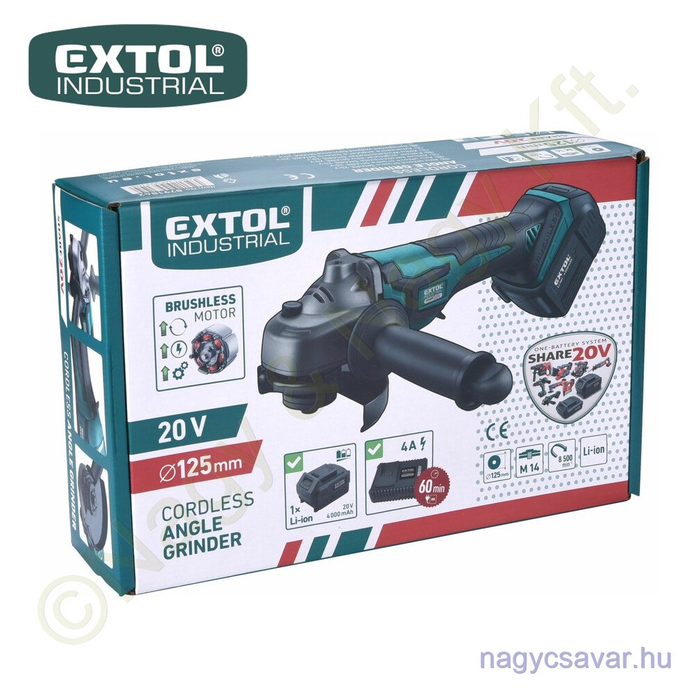 | Rövid leírás a termékről | Könnyű és nagy teljesítményű kefe nélküli akkumulátoros sarokcsiszoló csiszolási és vágási munkákhoz. A sarokcsiszolót a legkorszerűbb „kefe nélküli" motor hajtja. Ez az új motortípus hosszabb élettartammal rendelkezik, erősebb és kevesebb energiát fogyaszt, mint a hagyományos szénkefe motorok. Teste ergonomikusan van kialakítva, hogy munka közben könnyen kézben lehessen tartani, a gumírozott fogantyú pedig csillapítja a rezgéseket. Ennek a sarokcsiszolónak a fő előnye az akkumulátor meghajtás, amely lehetővé teszi, hogy a sarokcsiszolót magával vigye oda, ahol dolgoznia kell vele, függetlenül attól, hogy van-e tápfeszültség. A sarokcsiszoló biztonsági reteszeléssel rendelkezik a véletlen indítás ellen, és lágyan indul, így nem csak az ízületeit, hanem a sarokcsiszolóban lévő fogaskerekeket is kíméli. Rövid munkához elég egy-két 2000mAh-s akku, amit gyorsan feltölthet egy gyorstöltőben, igényesebb vagy hosszabb munkához a nagyobb akkumulátorokat ajánljuk 4000–8000mAh kapacitással. Az akkumulátor minden típusú EXTOL SHARE20V szerszámban használható, és az alkalmazott Li-ion technológiának köszönhetően bármikor újratölthető anélkül így csö