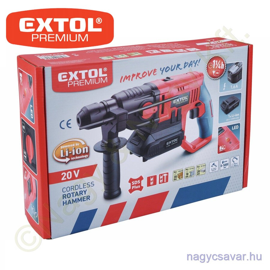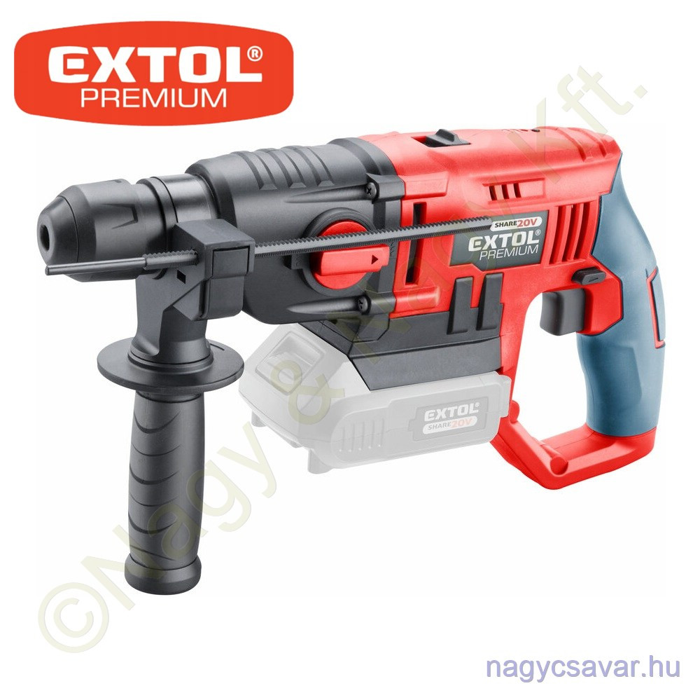 | Rövid leírás a termékről | Az akkus ütvefúró géppel (ütvefúrás bekapcsolásával) betonba, téglába, kőbe vagy más építőanyagba készíthet furatokat, illetve (ütvefúrás nélkül) fába, fémbe vagy műanyagokba. A pneumatikus kalapácsrendszernek köszönhetően sokkal gyorsabban és hatékonyabban képes fúrni. Fő előnye hogy magával viheti bárhova, ahol dolgoznia kell, függetlenül attól, hogy van-e fali aljzat. Az ütvefúró hátramenet funkciójának segítségével az elakadt fúró könnyen kihúzható. A fordulatszám fokozat megfelelő megválasztásával a munkadarab anyagának megfelelően lehet a fordulatszám tartományt beállítani. A normál munkavégzéshez elegendő egy vagy két 2000mAh-s akkumulátor, amelyeket gyorsan feltölthet egy gyorstöltőben, a nagyobb igénybevételű vagy hosszabb munkához 4000–8000mAh kapacitású akkumulátorokat ajánlunk. Az akkumulátor az EXTOL SHARE 20V sorozat minden szerszámában használható.