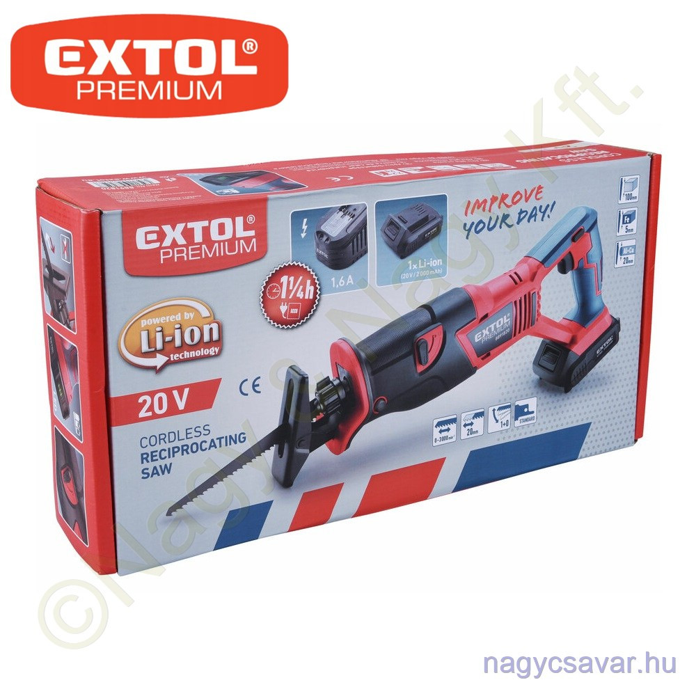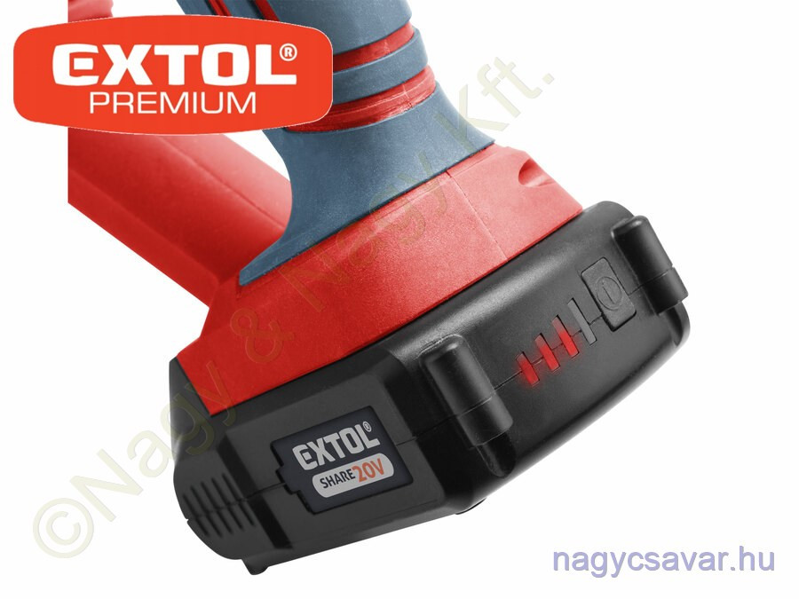 | Rövid leírás a termékről | Az akkus fűrészt fa, műanyag, fémek és más hasonló anyagok vágására tervezték műhelyben, garázsban vagy kertben. A rugalmas fűrészlap lehetővé teszi, hogy ne csak egyenes és ívelt vágásokat végezzen, hanem nehezen hozzáférhető helyeken is (a sarkokban, a fal mentén), a fákat metszve. Ennek a fűrésznek a fő előnye az akkus meghajtás, amely lehetővé teszi, hogy magával vigye ezt a fűrészt, ahol dolgoznia kell, függetlenül attól, hogy van-e áramforrás. A fűrész biztonsági zárral rendelkezik a véletlen indítás ellen, és állítható előtolással rendelkezik, amelyet a vágott anyagtól függően állíthat be. A normál munkavégzéshez elegendő egy vagy két 2000mAh-s akkumulátor, amelyeket gyorsan feltölthet egy gyorstöltőben, a nagyobb igénybevételű vagy hosszabb munkához nagyobb, 4000–8000mAh kapacitású akkumulátorokat ajánlunk. Az akkumulátor az EXTOL SHARE20V sorozat minden szerszámában használható. Az alkalmazott Li-ion technológiának köszönhetően bármikor újratölthető, anélkül, hogy csökkentené a kapacitását. A Li-ion akkumulátor nagyon lassan veszít energiából az önkisülés következtében, így hosszú az élettartama.